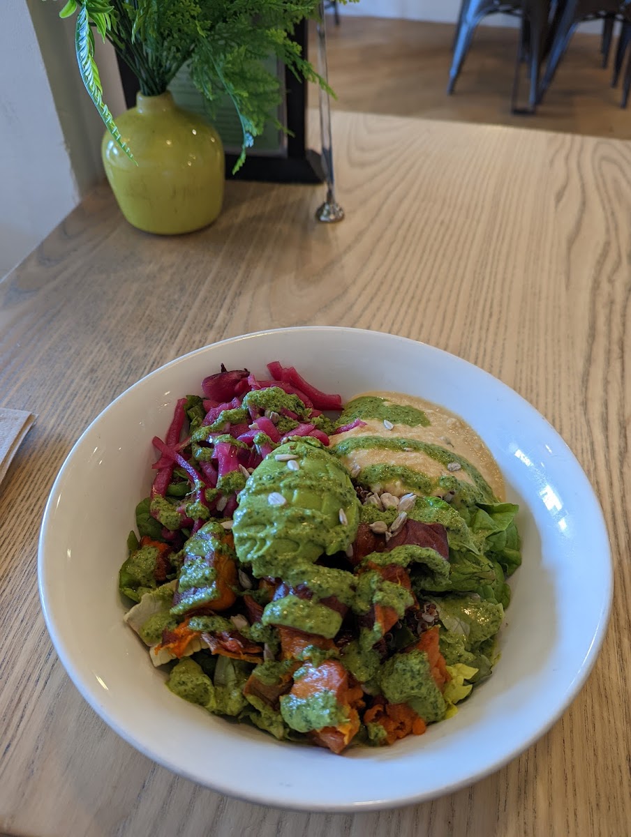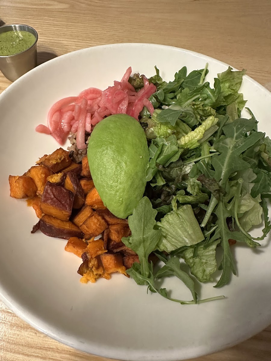 First time trying this restaurant and it did not disappoint. The menu selection is very simple & the price can be a little pricey for how simple it is, but it's worth it! I like making my own bowl, so I can pick & choose what toppings I like and when they combined all of it together it was very flavorful & healthy. I like how everything in this place is self-service. You go in to pick a table, then order through your phone (or the cashier) and they serve you your food (but you have to grab your utensils & put your dishes away like at a food court). The ambiance inside is way nicer than the outside. The only downside for me with this place is the location since it's located in the Mission meaning it can be impossible to find parking.